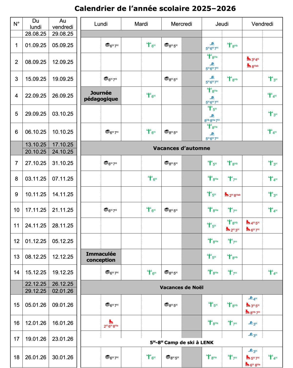 Calendrier & Horaire des classes